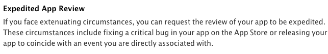 Note: If you need fast approval for an urgent bug fix or time-sensitive event, Apple does have an expedited review process.